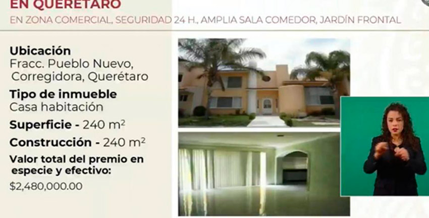 La directora de la Lotería Nacional, Margarita González, durante la Mañanera en Palacio Nacional anunció que el próximo 15 de septiembre se realizará un sorteo por parte del Instituto para Devolverle al Pueblo lo Robado (INDEP), en donde se incluye una vivienda en Querétaro ubicada en el fraccionamiento Pueblo Nuevo, en el municipio de Corregidora, cuenta con 240 metros cuadrados y tiene un valor de 2 millones 480 mil pesos.