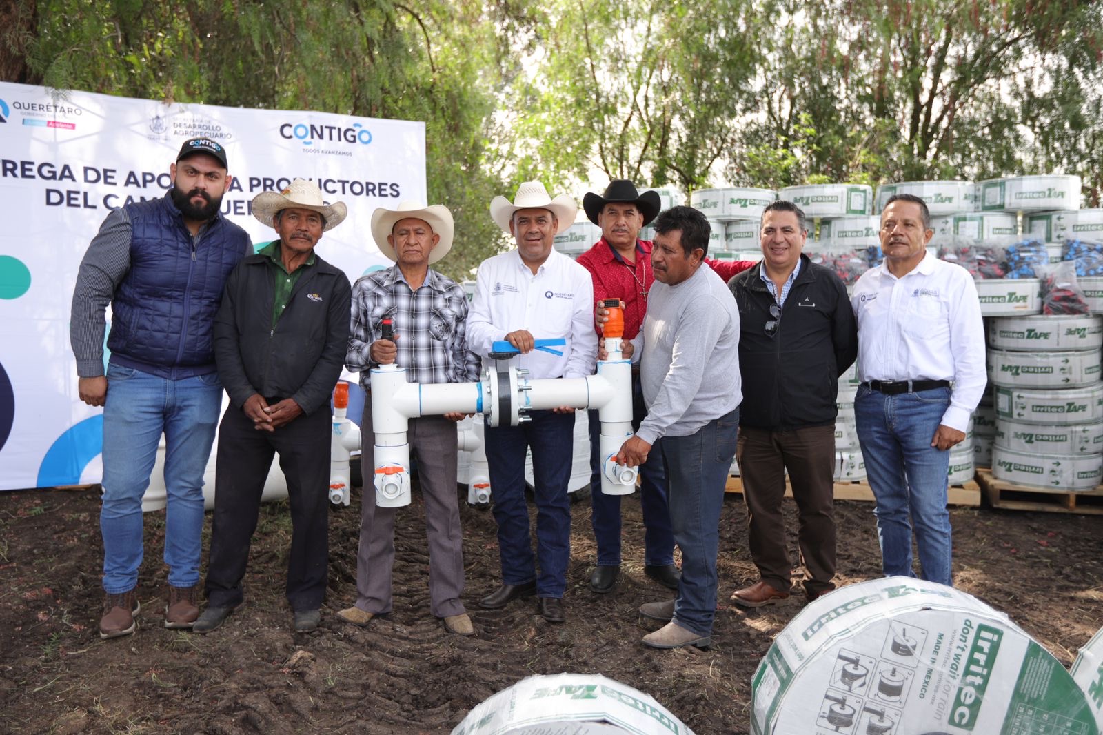 El secretario de Desarrollo Agropecuario, Rosendo Anaya Aguilar, llevó a cabo la entrega de oficios de autorización de apoyo con sistema de riego por goteo a productores en la comunidad de La Valla, en San Juan del Río, lo que beneficia a 30 productores beneficiados para una superficie cercana a las 107 hectáreas, con una bolsa compuesta por una aportación estatal de cinco millones 372 mil pesos, sumados a la aportación de los productores por dos millones 384 mil pesos, para una inversión total de siete millones 756 mil pesos.