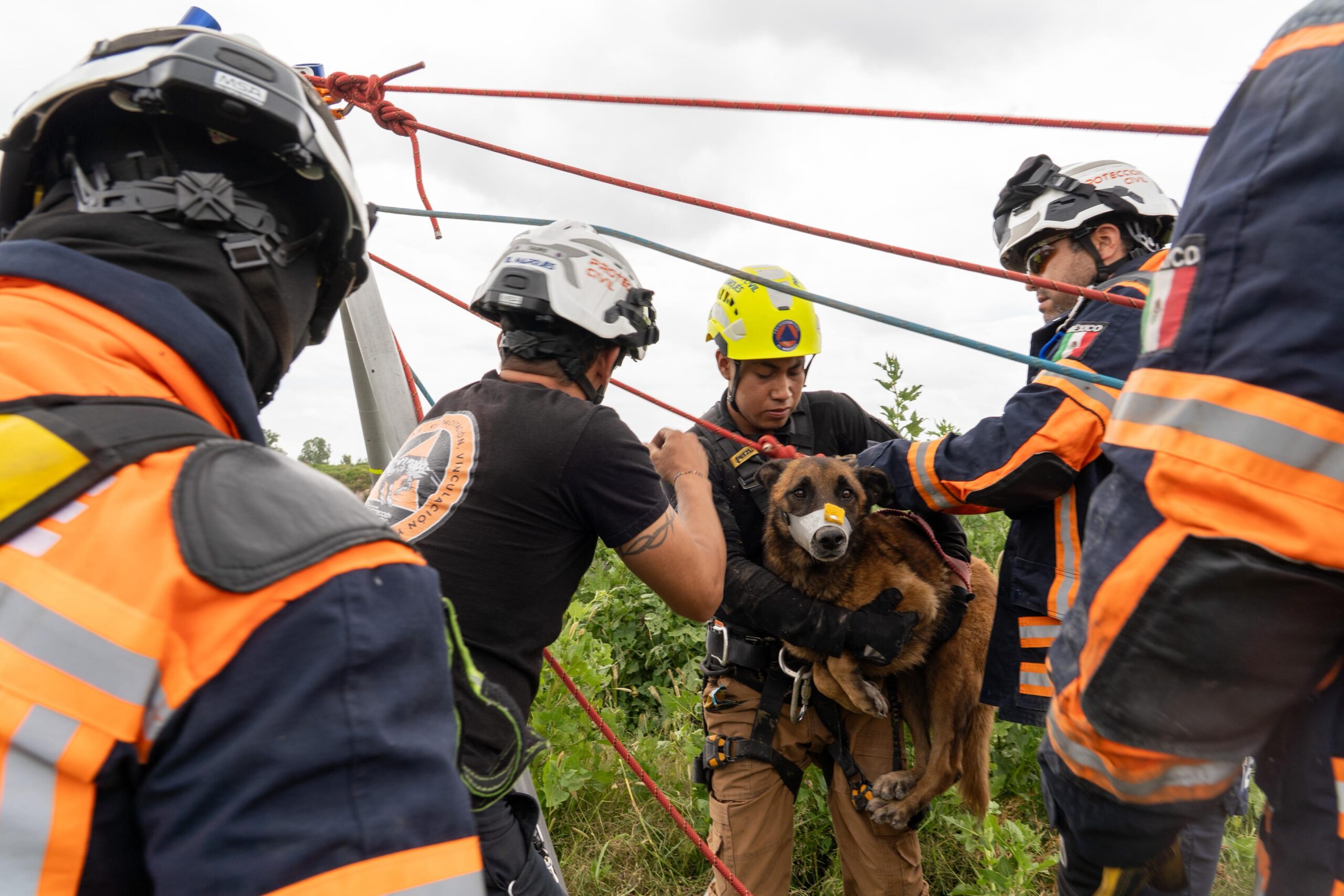 Para el rescate, los cuerpos de emergencia de Protección Civil emplearon una maniobra de tripié especial que permitió descender de forma segura a un elemento de Rescate Animal hasta donde se encontraba el can. Posteriormente, con el mismo sistema y mediante un mecanismo de ventaja mecánica, se logró la recuperación tanto del rescatista como del canino, concluyendo la operación de manera exitosa.