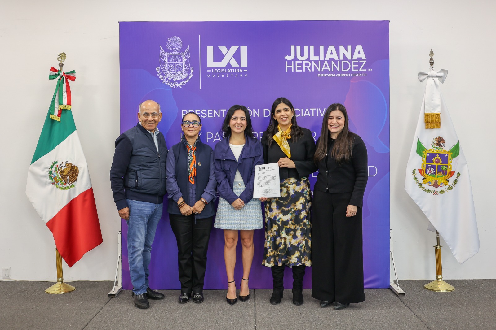La diputada Juliana Hernández Quintanar, integrante del Grupo Legislativo del PAN, acompañada de las diputadas Leonor Mejía Barraza y Teresita Calzada Rovirosa, así como el legislador Antonio Zapata Guerrero, y la Lic. en Derecho y especialista en derechos humanos Valeria González Ruiz, ingresó en la Oficialía de Partes del Poder Legislativo, la Iniciativa de Ley que reforma y adiciona diversas disposiciones de la Ley para Prevenir y Eliminar toda forma de Discriminación en Querétaro y la Ley Estatal de Acceso de las Mujeres a una Vida Libre de Violencia, en materia de discriminación laboral por embarazo».